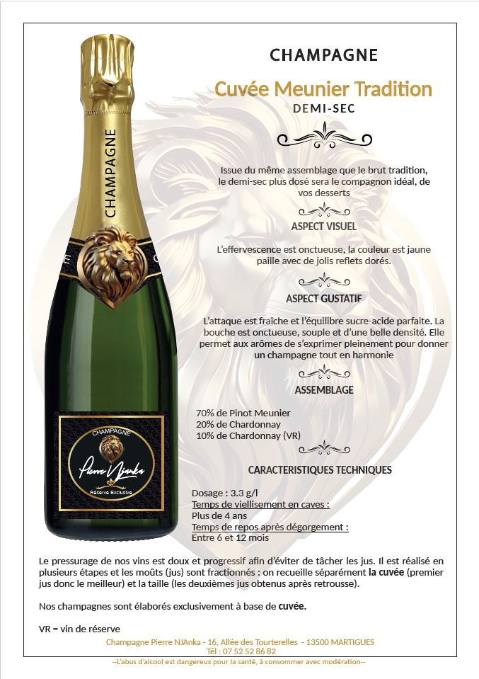 Le Champagne Pierre NjAnka Cuvée Meunier Tradition Demi-Sec est un vin riche et gourmand, issu du même assemblage que le Brut Tradition mais avec un dosage plus élevé pour en faire le compagnon idéal de vos desserts.
