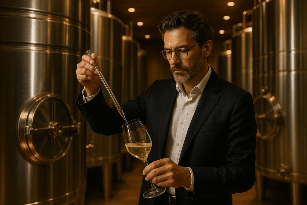 Chaque composant est dégusté, analysé, puis ajusté afin d’obtenir un équilibre entre fraîcheur, structure et complexité aromatique.